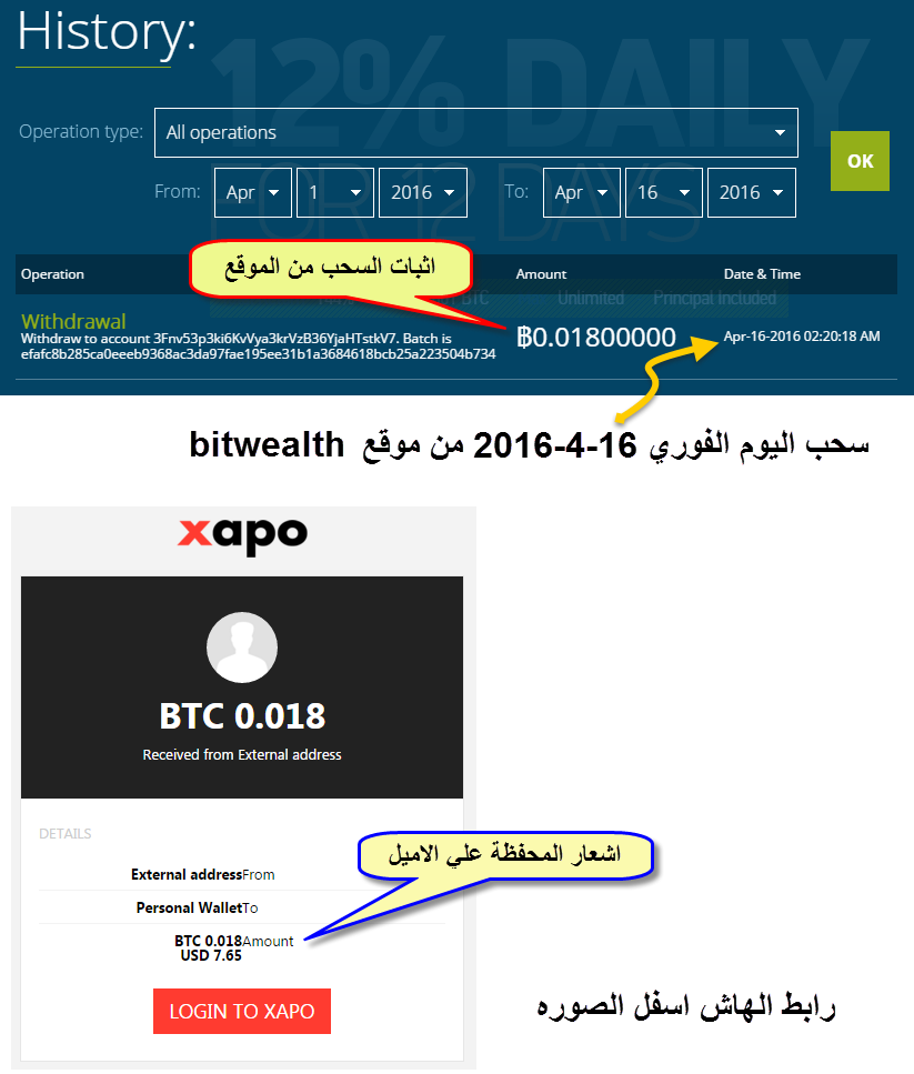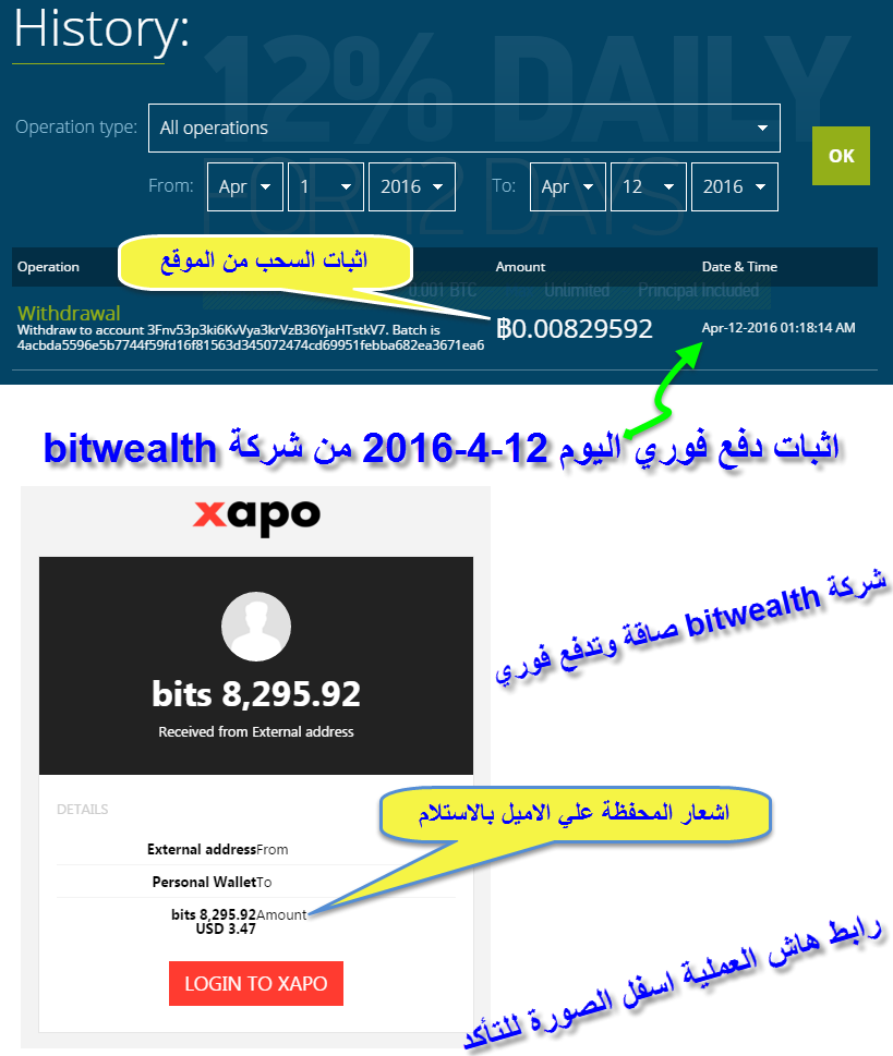 . . . اثبات دفع فوري بتاريخ اليوم 2016/4/12 من شركة bitwealth http://irba7.com/upload/do.php?img=4582 هاش العملية للتأكد من السحب https://blockchain.info/tx/4acbda559...ba682ea3671ea6 بالتوفيق للجميع . . |